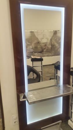 Nabízíme kadeřnické obsluhy v kombinaci sklo a dřevo vysoký lesk s podsvícením a odkládacím stolkem. Montováne na zeď. Cena za kus 6000,- pouze osobní odběr. K dispozici 2.1.2019